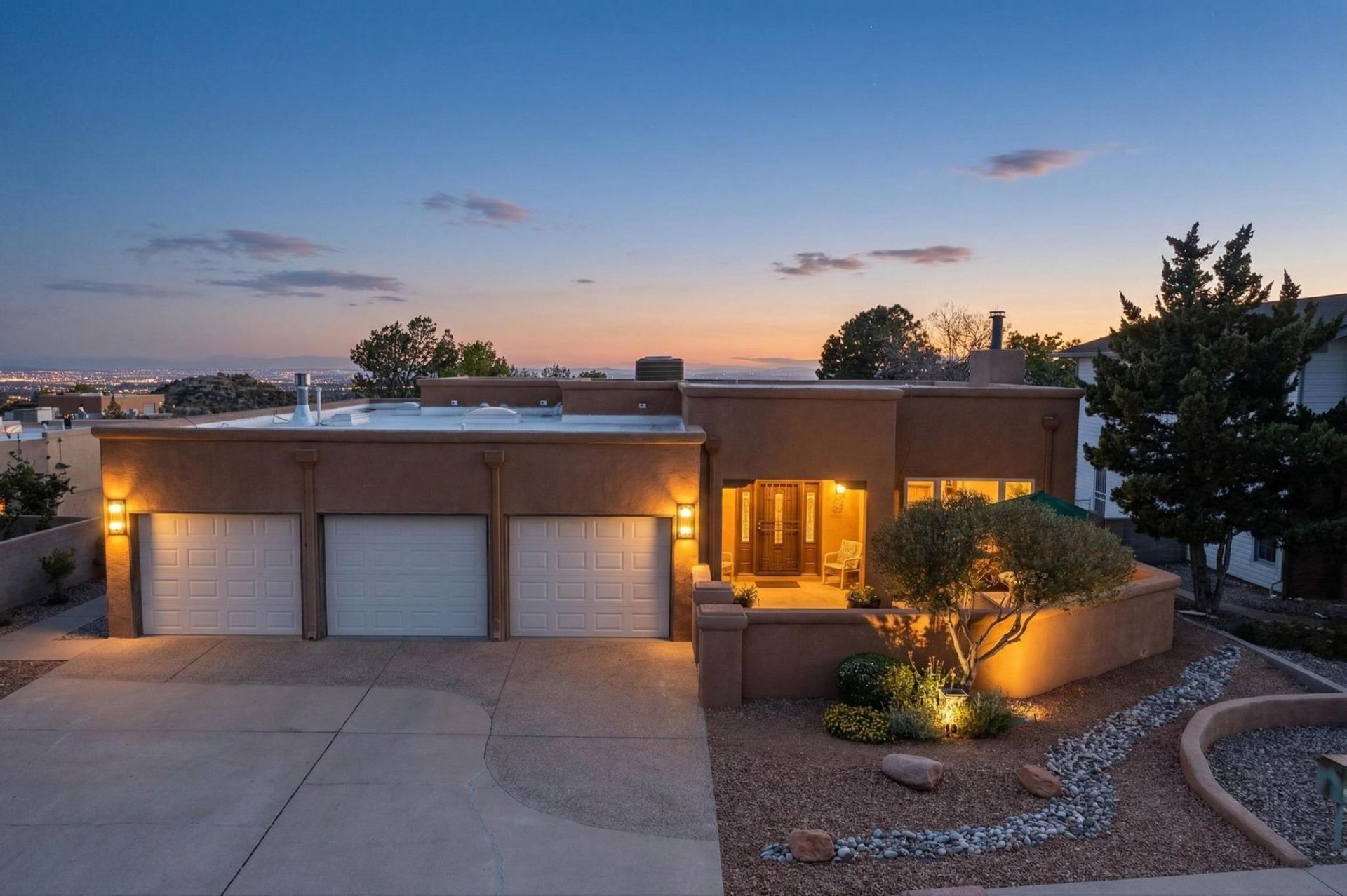 Located in the desirable Sandia Foothills, this distinctive Architectural Contemporary Southwestern home offers an east-facing front courtyard with striking mountain views, sunset + sparkling city lights from the expansive west-facing deck, and easy access to nearby hiking and biking trails. The main-level primary suite as well as the beautifully updated kitchen and main living spaces open to the back deck for effortless indoor-outdoor living. Fully renovated kitchen and bathrooms, all-new premium tile flooring, updated contemporary lighting, and a TPO roof installed in 2023 make this well designed home as functional as it is beautiful. Striking tongue-and-groove ceilings, skylights, oversized windows, and warm architectural details create a truly special Sandia Foothills retreat.
