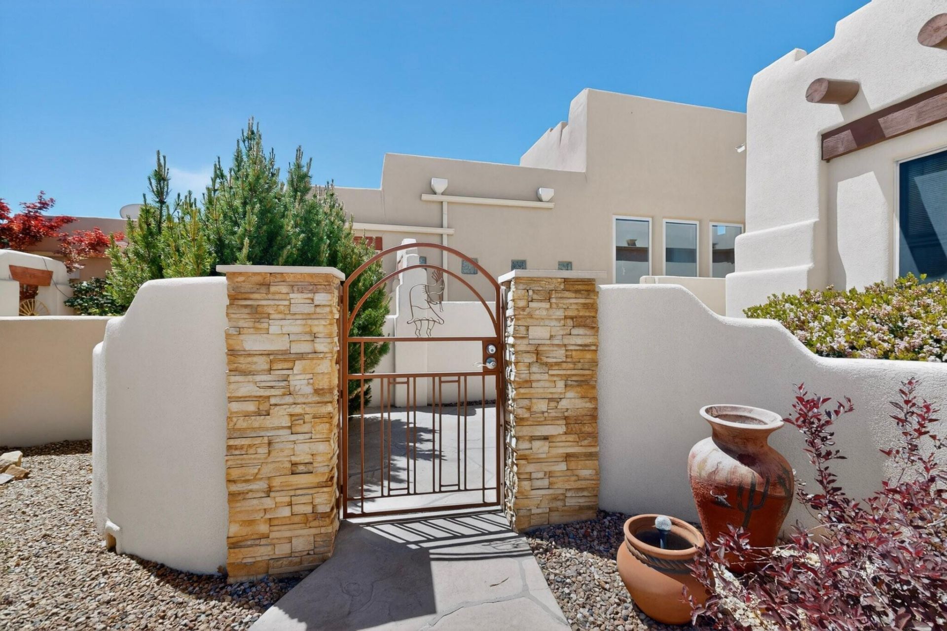 Set in the highly sought-after High Desert, this 3-bedroom, 2-bath, 2-car garage home offers 1,923 sq ft of thoughtfully designed, low-maintenance living with a true lock-and-leave lifestyle. Ideal for frequent travelers, snowbirds, or busy professionals, this home allows you to be away for weeks or months with ease and peace of mind.From the moment you arrive, the stacked stone exterior and custom faux flagstone walkway create inviting curb appeal. Inside, a spacious great room welcomes you with soaring wood ceilings, exposed vigas, and a kiva-style gas fireplace, creating a warm and comfortable atmosphere. Porcelain tile flooring in varied patterns runs throughout--no carpet anywhere.The kitchen is both functional and inviting, featuring granite countertops, a large island with